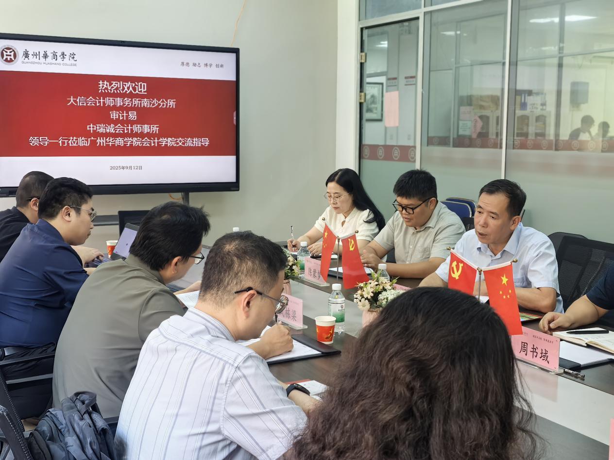 2025年9月12日,大信会计师事务所南沙分所高级项目经理邵磊、综合部经理王梦歌携达尔文智慧科技(广州)有限公司审计技术负责人-技术总监沈嘉迪、市场部负责人-运营总监蔡宝弘及中瑞诚会计师事务所权益合伙人、广东分所所长武栋梁莅临我集团,就进一步深化校企合作进行了深入交流。院长姚凤民,副院长周书域,院长助理陈蒙梦,数智会计与商务服务产业学院副院长范卫星,会计系主任唐丽华,审计系主任张丽、副主任郭晨参加座谈会,会议由副院长周书域主持。
