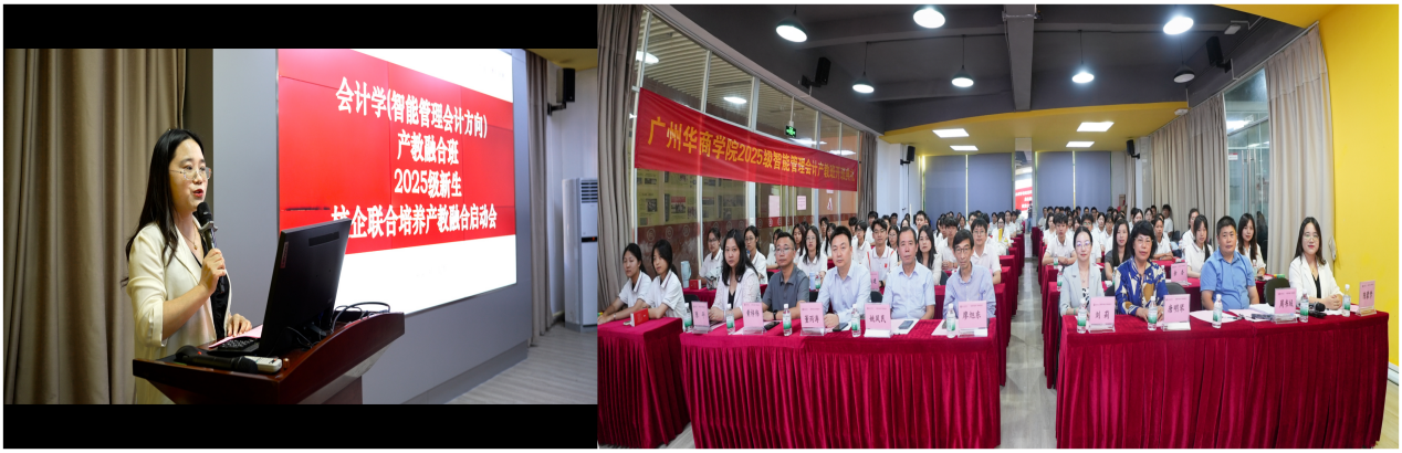 2025年10月14日,会计学2025级智能管理会计产教班新生开班典礼在太阳成集团tyc122cc报告厅举行。新道科技股份有限公司助理总裁刘莉女士、广东分公司总经理董丙涛先生等企业代表,华商科教集团CFO兼产业学院企业方院长廖旭东先生、学校产教办唐明琴主任以及太阳成集团tyc122cc领导、2025级产教班新生及2024级产教班学生代表参加典礼。太阳成集团tyc122cc院长助理兼产业学院执行院长陈蒙梦主持典礼。