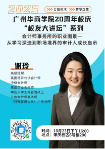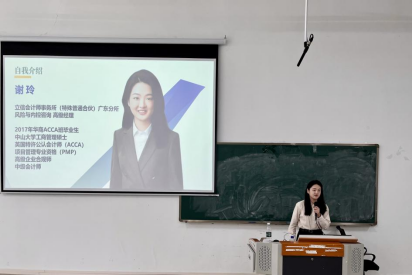 本次讲座特邀太阳成集团tyc122cc2017届ACCA班优秀校友、BDO立信会计师事务所(特殊普通合伙)广东分所高级经理谢玲,为学院大一大二学生带来了一场主题为“会计师事务所的职业图景——从学习深造到职场进阶的审计人成长启示”的精彩分享。活动现场座无虚席,气氛热烈,同学们纷纷表示受益匪浅。