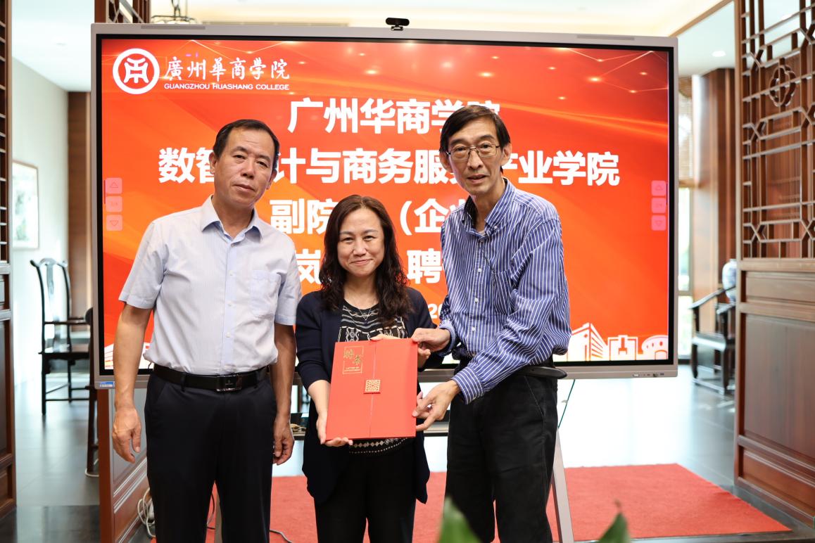 聘书颁发环节,廖旭东先生与姚凤民先生共同为梁岚女士颁发数智会计与商务服务产业学院(企业方)副院长聘书,标志着梁岚女士正式加入产业学院团队,校企合作开启新征程。